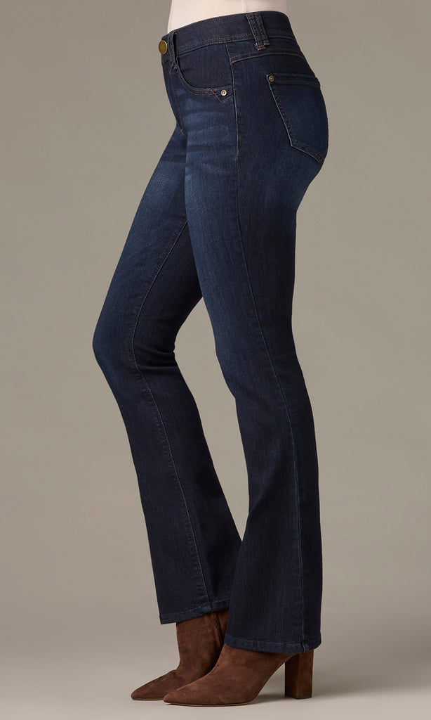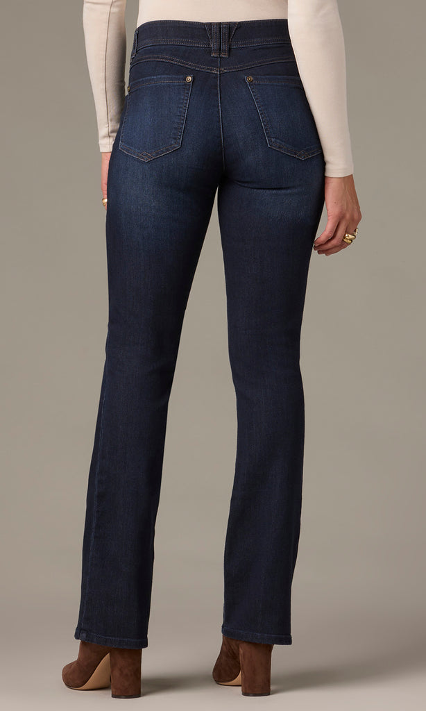 A timeless bootcut silhouette meets everyday comfort in these dark-wash Brittany jeans. Designed to flatter with a contoured waistband and subtle fading, this pair offers both style and ease. The classic five-pocket construction and clean hem finish make them endlessly versatile, from day-to-day wear to dressier looks with heels.