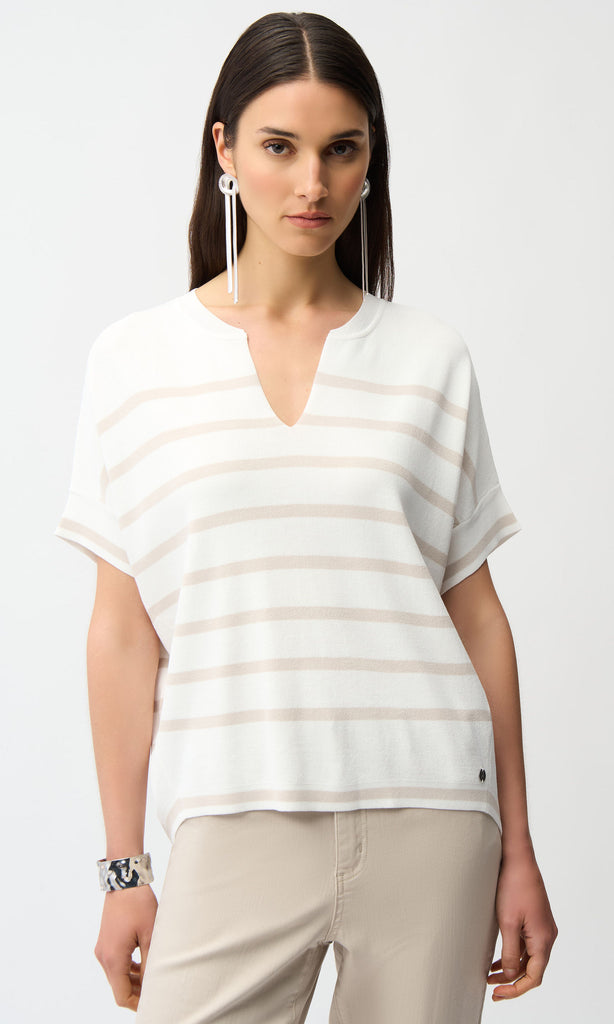 A modern essential with a refined, relaxed feel, this striped short sleeve knit top is designed to bring effortless style to everyday dressing. Crafted from a soft rayon-blend, it offers a smooth, lightweight feel with a fluid drape that moves naturally with the body, creating a comfortable yet polished look.