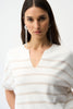The relaxed silhouette falls easily through the body, offering a flattering fit that doesn’t cling while maintaining a clean shape. A subtle notch neckline adds a contemporary touch, elevating the design beyond a basic tee, while the short sleeves with rolled cuffs enhance its laid-back appeal. The horizontal stripe pattern introduces understated texture, making it easy to pair with both casual and more elevated pieces.