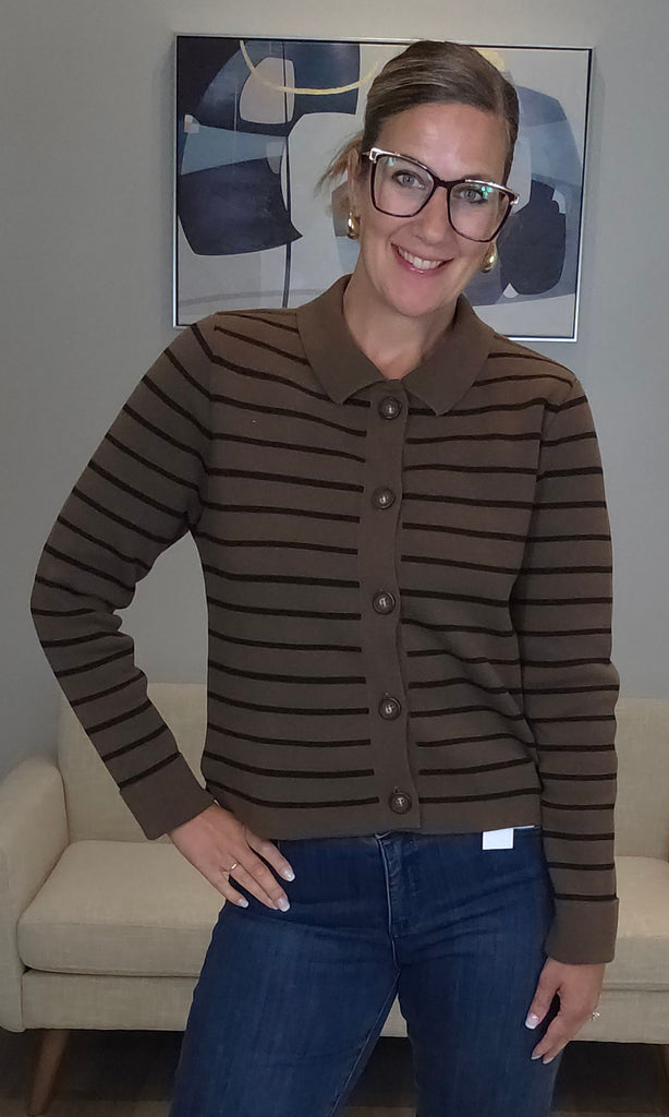 This striped button-front cardigan that blends classic charm with a modern silhouette. Done in rich chocolate brown with darker horizontal stripes, it features a structured collar and large statement buttons for a refined, polished look. The soft knit fabric provides comfortable stretch, while the straight hem and fitted cut make it easy to style buttoned up or layered open over a tee or blouse.