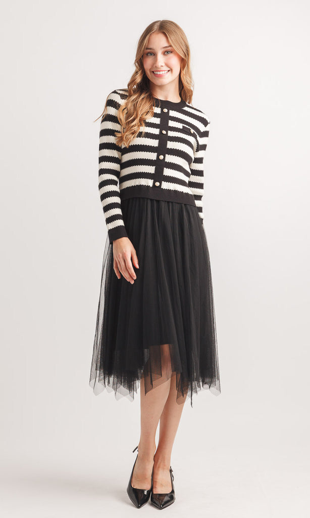 Effortlessly chic with a touch of Parisian flair, this dresss combines timeless sophistication with modern femininity. The fitted knit bodice features bold black-and-white horizontal stripes, accented by gold-tone buttons and a classic crew neckline for a refined finish. The look flows seamlessly into a soft black tulle skirt that adds movement, texture, and a hint of romance.