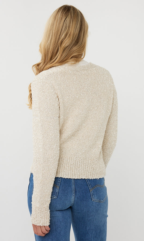 This soft cream cardigan adds a touch of cozy sophistication to any look. Designed with a subtle textured knit and a flattering V-neckline, it features three statement buttons that bring a modern, polished accent to the classic silhouette. Its cropped length and relaxed fit make it perfect for layering over blouses or turtlenecks.