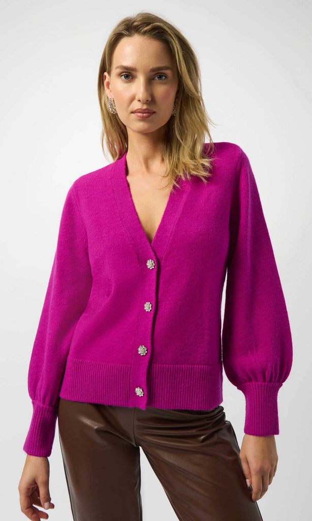 Elevate your layering game with this chic cardigan, featuring a flattering V-neckline, long puff sleeves, and dazzling rhinestone buttons for a touch of glamour. Crafted from a soft sweater knit, it offers a straight silhouette that combines effortless style with cozy comfort. Perfect for pairing with high-waisted jeans or a sleek pencil skirt for an effortlessly polished look.