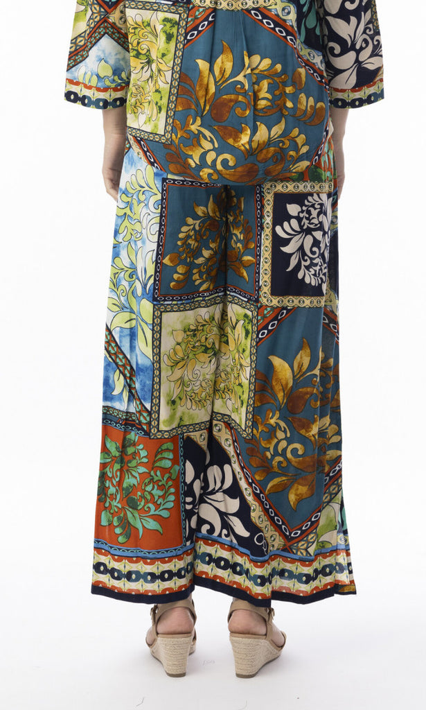 The striking patchwork-inspired print blends rich colors and intricate patterns for a statement look that feels both artistic and sophisticated. Designed with an easy, relaxed fit and wide-leg silhouette, these pants deliver all-day comfort while maintaining a polished feel. Pair them with a simple tee, blouse, or the coordinating top for a complete, eye-catching outfit.