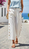 A refined wide leg crop with subtle statement detail. Designed with a clean front and decorative side button accents along the leg, this silhouette offers movement and structure in equal measure. A polished option for warm-weather styling, travel, or relaxed evenings out.