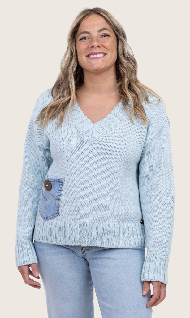 Soft, cozy, and effortlessly stylish, this cloud blue V-neck knit sweater is a versatile everyday essential. Crafted from a textured knit, it features a flattering V-neckline, relaxed fit, and ribbed trim at the cuffs and hem for structure and comfort. A unique denim patch pocket with button detail adds a modern, casual touch that sets this sweater apart from basic knits. The light blue “cloud” tone makes it easy to pair with denim, white pants, or neutral bottoms for a fresh, polished look.