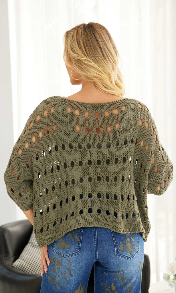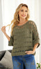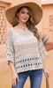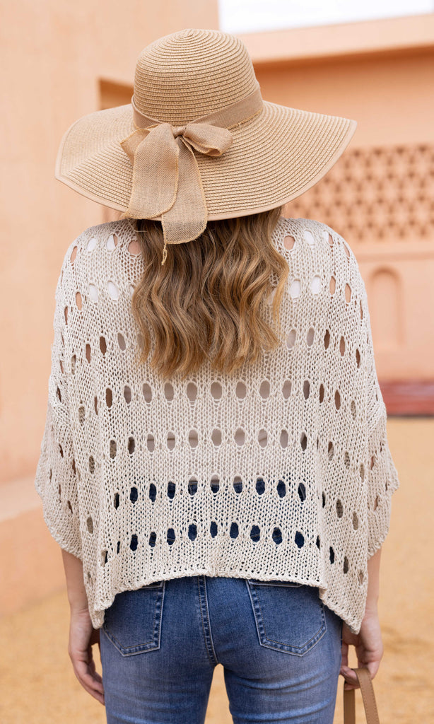 A lightweight knit pullover designed with an airy open-stitch pattern for breathable comfort and dimensional texture. The relaxed silhouette is complemented by soft dolman sleeves and a wide neckline that drapes naturally for a flattering, laid-back fit. Finished with a straight hem, this versatile piece layers effortlessly over camisoles, tanks, or swimwear for casual, everyday styling.