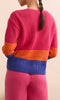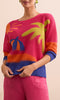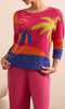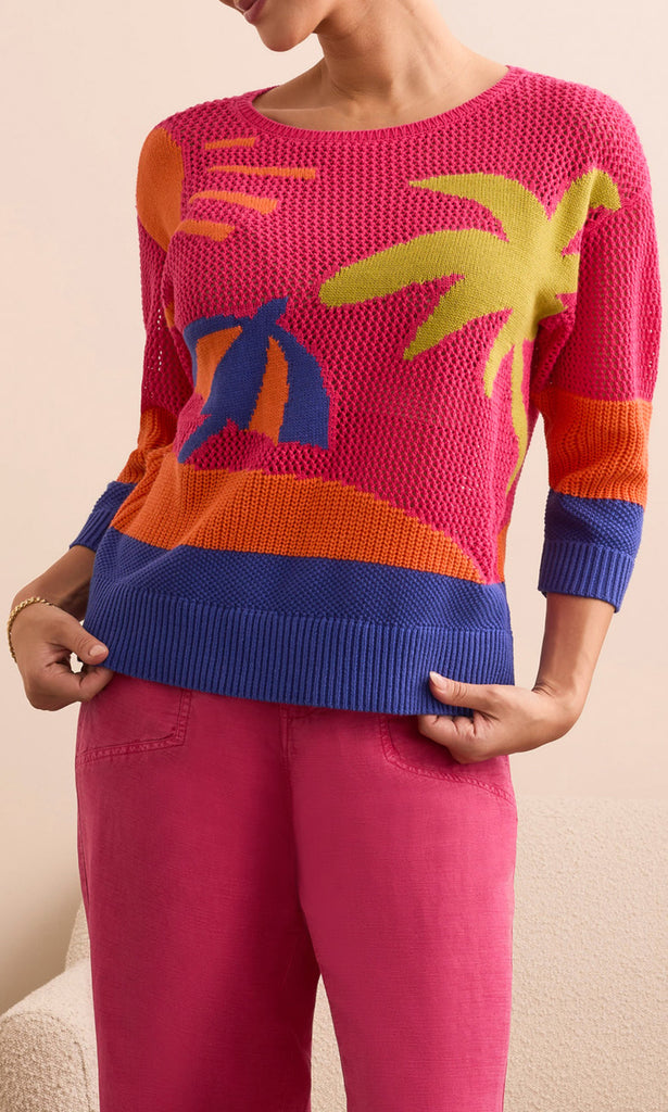 Crafted in a textured open-knit pattern, this lightweight sweater features a lively tropical scene with palm trees and sunshine motifs in vivid shades of fuchsia, orange, cobalt, and chartreuse. The relaxed fit, ribbed trim, and three-quarter sleeves make it both comfortable and effortlessly stylish. Perfect for adding a pop of color to denim or casual pants.