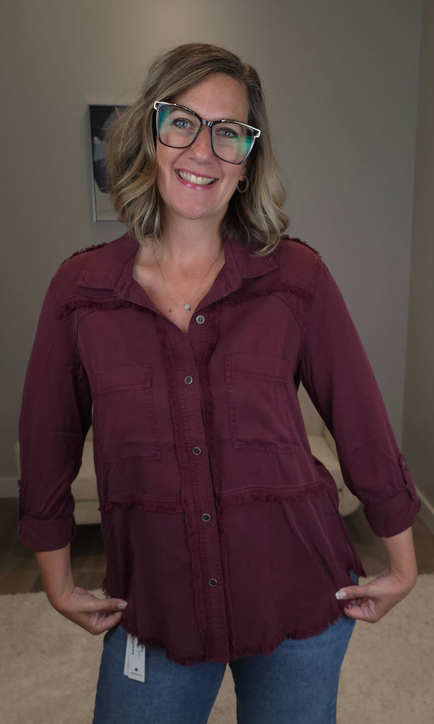 This button-front top combines casual comfort with refined texture. Designed in a rich burgundy hue, it features front flap pockets and raw-edge seaming that add a touch of laid-back style. The soft, lightweight fabric drapes effortlessly, while roll-tab sleeves allow for easy styling versatility. A perfect piece for layering or wearing solo, it transitions seamlessly from weekday to weekend.