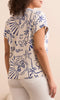 Featuring a playful ocean-inspired print in rich cobalt blue on a soft ivory backdrop, this short-sleeve top captures a breezy, seaside feel. The relaxed silhouette and lightweight fabric make it an effortless choice for warm days, while the cuffed sleeves add a polished finish. Perfect for pairing with white denim or linen shorts for a fresh, nautical-inspired look.