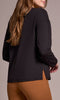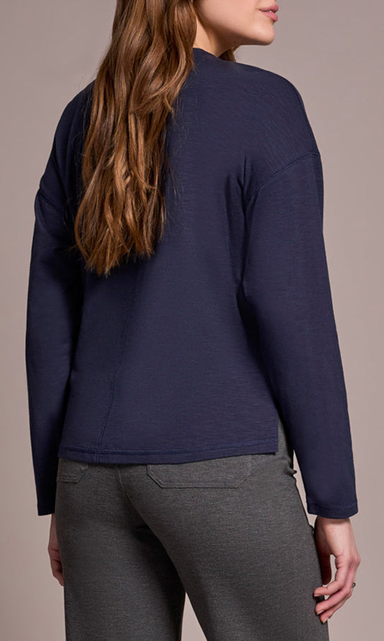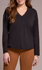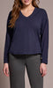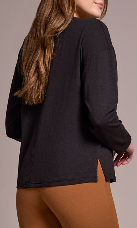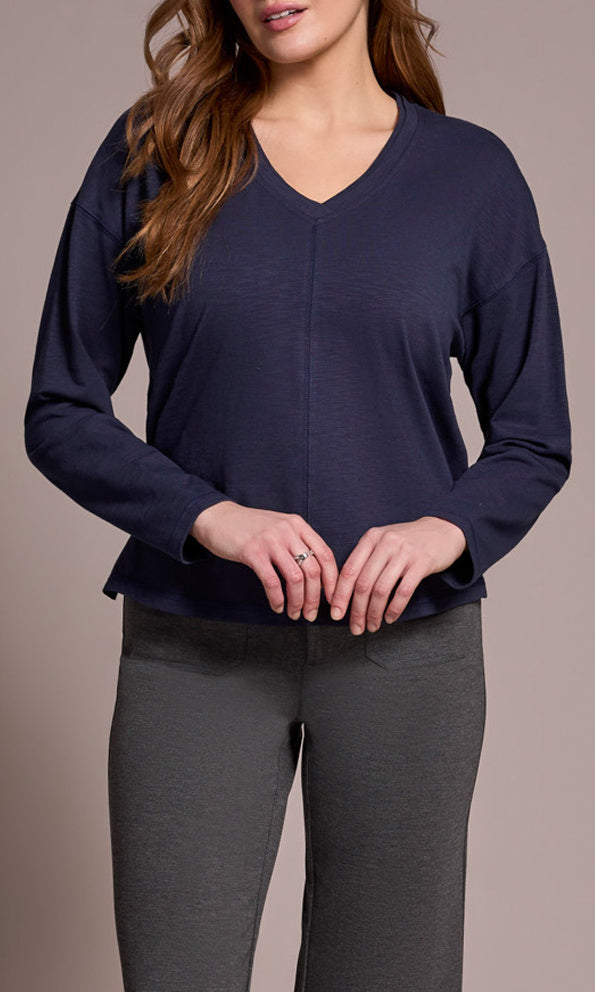 A timeless essential with modern simplicity, this V-neck long sleeve top offers an easy, relaxed fit with subtle structure. Designed with a center seam detail that elongates the silhouette, it features drop shoulders and side slits at the hem for comfortable movement. Perfect for layering or wearing solo for a clean, effortless look.