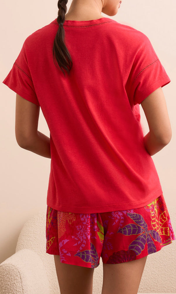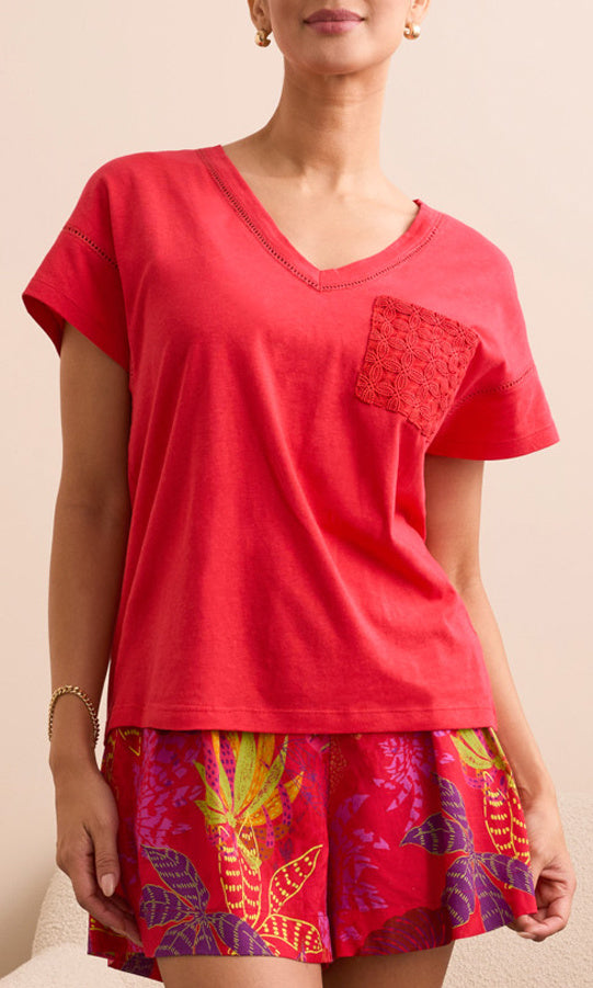 Crafted from soft, breathable cotton, this relaxed-fit top features delicate open-stitch detailing along the neckline and sleeves for a subtle touch of texture. A tonal crochet-style front pocket adds an artisanal accent, making it stand out while maintaining an easy, casual feel. Pair it with printed shorts, linen pants, or denim for a bright and effortless everyday look.