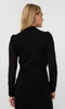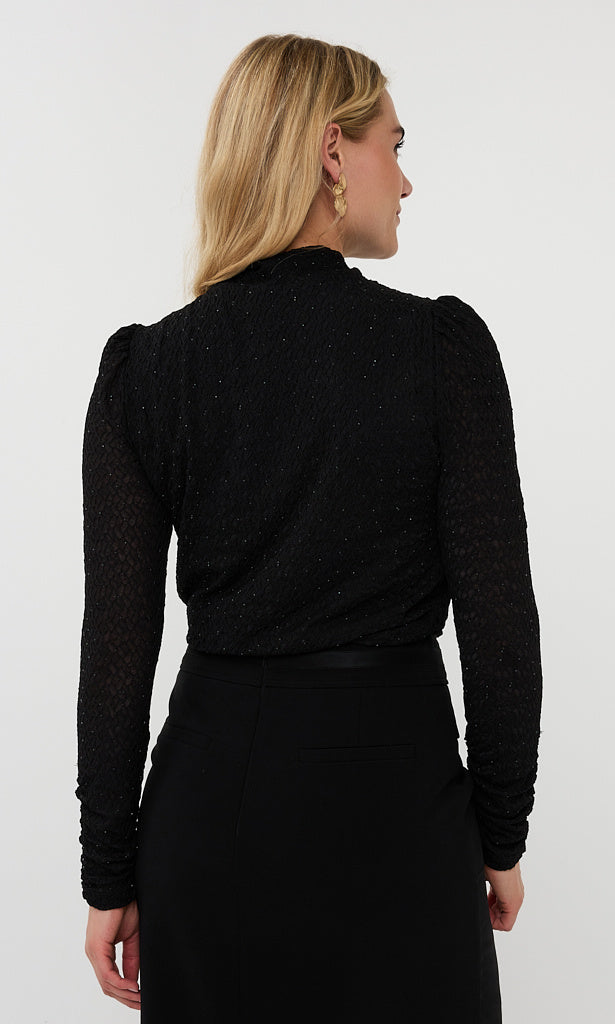 Elevate your wardrobe with this elegant black textured top. Designed with a subtle shimmer woven throughout, it adds just the right touch of sophistication. The high neckline and slim long sleeves create a refined silhouette, while delicate ruching along the arms and lightly gathered shoulders bring soft, feminine structure. Perfect for pairing with tailored skirts or sleek trousers, this piece transitions effortlessly from day to evening.