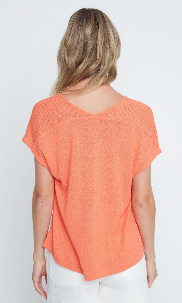 A breathable knit top with a fluid drape and modern ease. The V-neckline and relaxed shape create a flattering fit, while the lightweight texture makes it ideal for layering or wearing on its own. A versatile staple for everyday styling.
