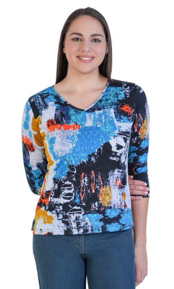 This printed V-neck top adds a modern, artistic touch to your everyday wardrobe. Designed in a soft, comfortable knit, it features an abstract brushstroke print with rich color variation for a bold yet wearable look. The flattering V-neckline and three-quarter sleeves create an easy silhouette that works effortlessly for day-to-day styling.