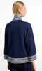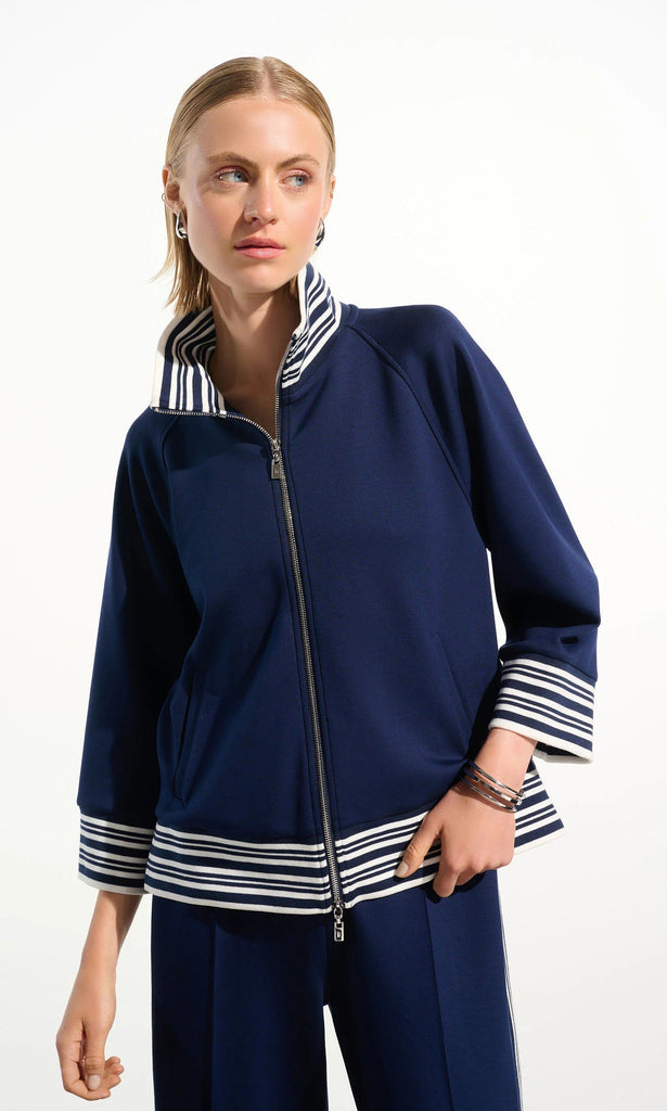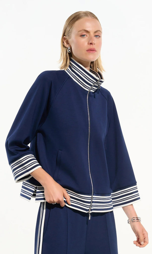 This scuba jersey jacket blends sporty flair with polished edge. Featuring a metallic front zipper, striped rib trim and three-quarter raglan sleeves, it’s made for easy layering without compromising style.