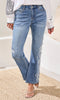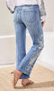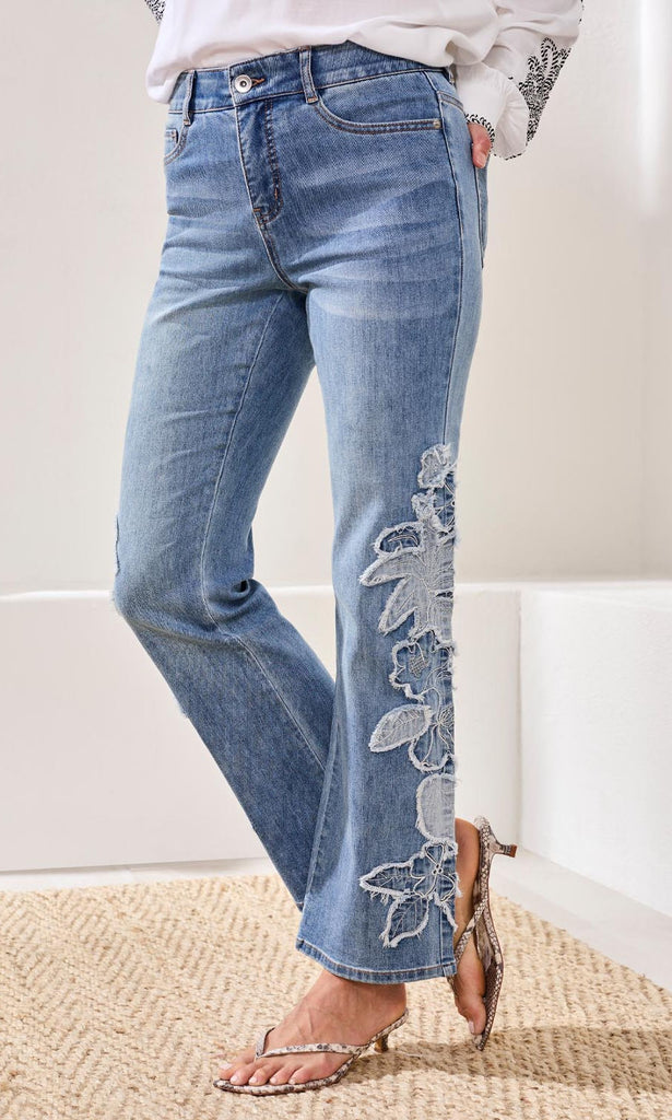 A feminine update to classic wide leg denim. This statement jean features floral-inspired distressed detailing along the leg, adding texture and interest while keeping the silhouette wearable. The mid-rise fit and relaxed leg create a flattering shape that pairs beautifully with everything from blouses to knits.