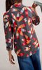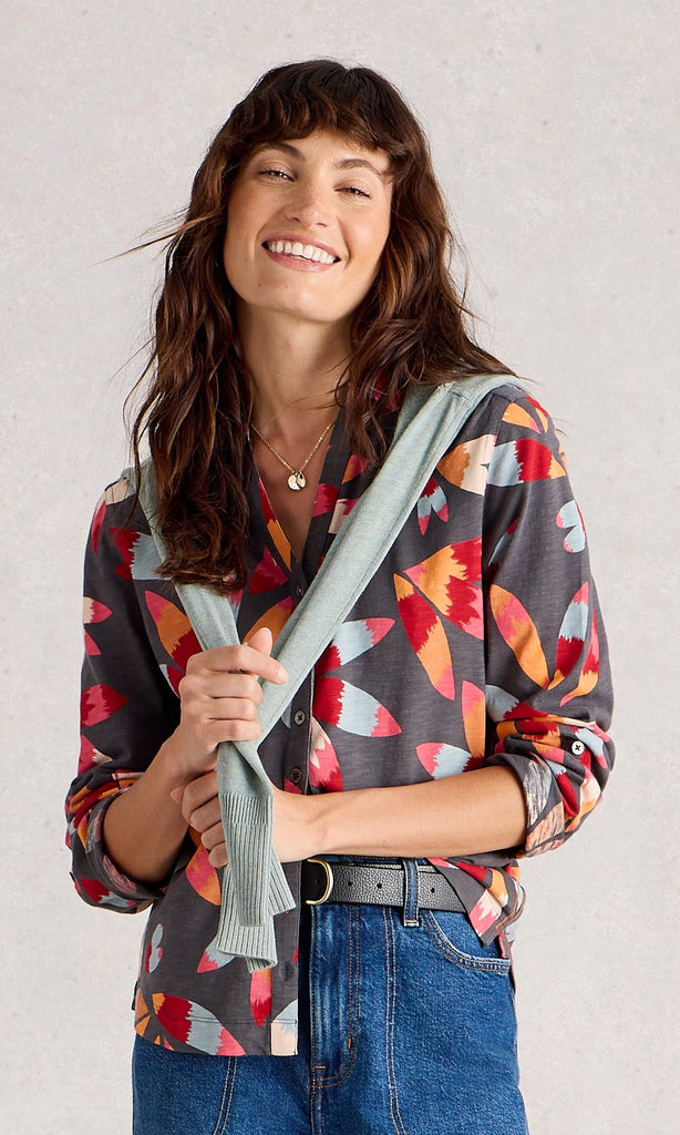 Make a bold yet playful statement in this button-down shirt featuring an abstract floral motif. Designed with a relaxed fit and collared neckline, it offers effortless versatility and comfort. The vibrant print in shades of red, orange, peach, and blue pops against the charcoal grey base, making it a standout piece for everyday wear. Finished with button cuffs and a curved hem, this shirt pairs easily with denim or trousers for a polished casual look.