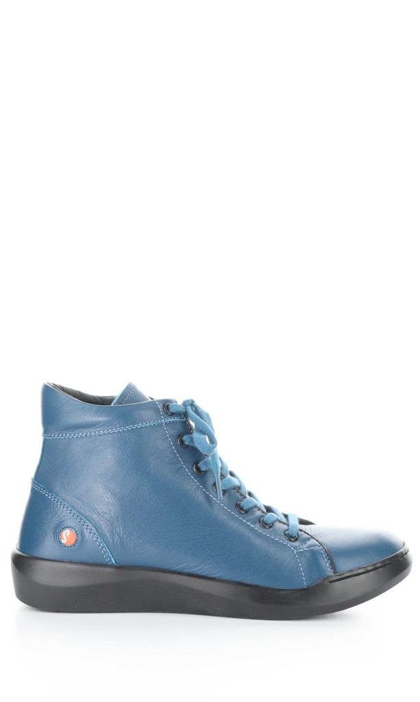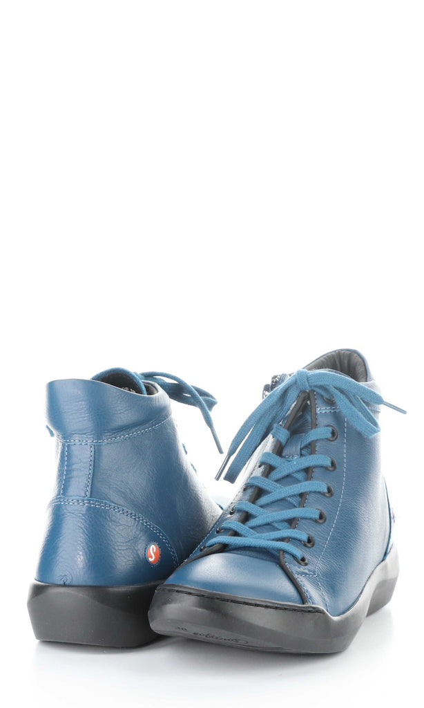 Sleek and sporty with a casual edge, these Softinos high-top sneakers are crafted from supple smooth leather in a rich blue denim shade. Designed for comfort, they feature a lace-up front paired with an inside zipper for easy on-and-off wear. The flexible rubber sole with Softinos’ signature wavy tread provides all-day cushioning and grip, while the subtle stitched detailing and round logo accent at the heel add a distinctive touch.