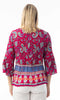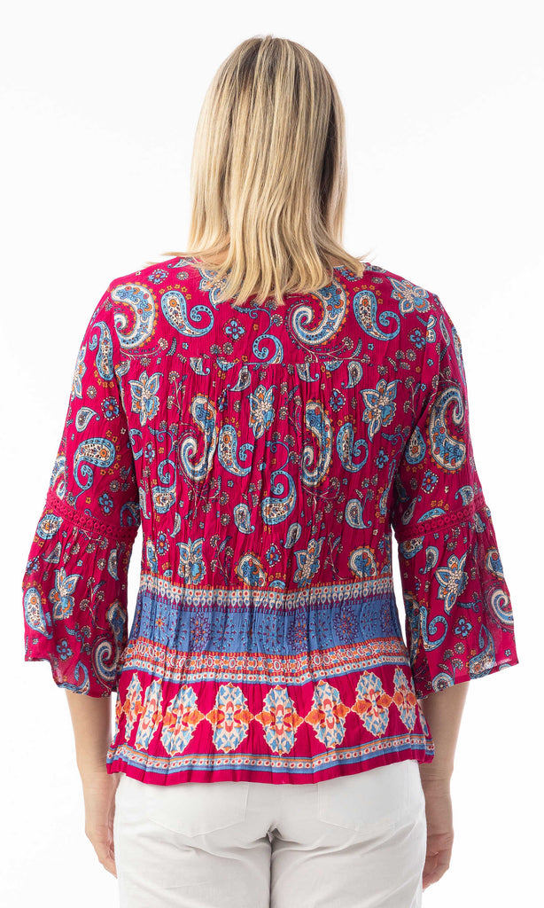A lightweight woven blouse designed with an intricate paisley motif and a contrasting border hem for a globally inspired look. The relaxed silhouette features a split neckline with tassel ties and soft gathers through the body for natural movement. Finished with three-quarter bell sleeves and a peplum hem, this piece pairs effortlessly with denim or tailored bottoms for everyday styling.
