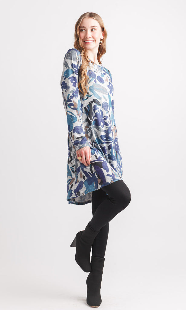 An effortless piece with artistic flair, this tunic dress features a painterly floral print in rich shades of navy, blue, and grey. Designed with a relaxed fit, it drapes beautifully and offers comfort without sacrificing style. The hi-lo hemline adds movement and a modern touch, making it versatile for pairing with leggings or boots.