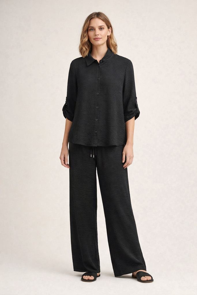 Effortlessly polished with a relaxed feel, these textured wide leg pants are designed for both comfort and versatility. The subtle crinkle texture adds dimension while maintaining a clean, elevated look.